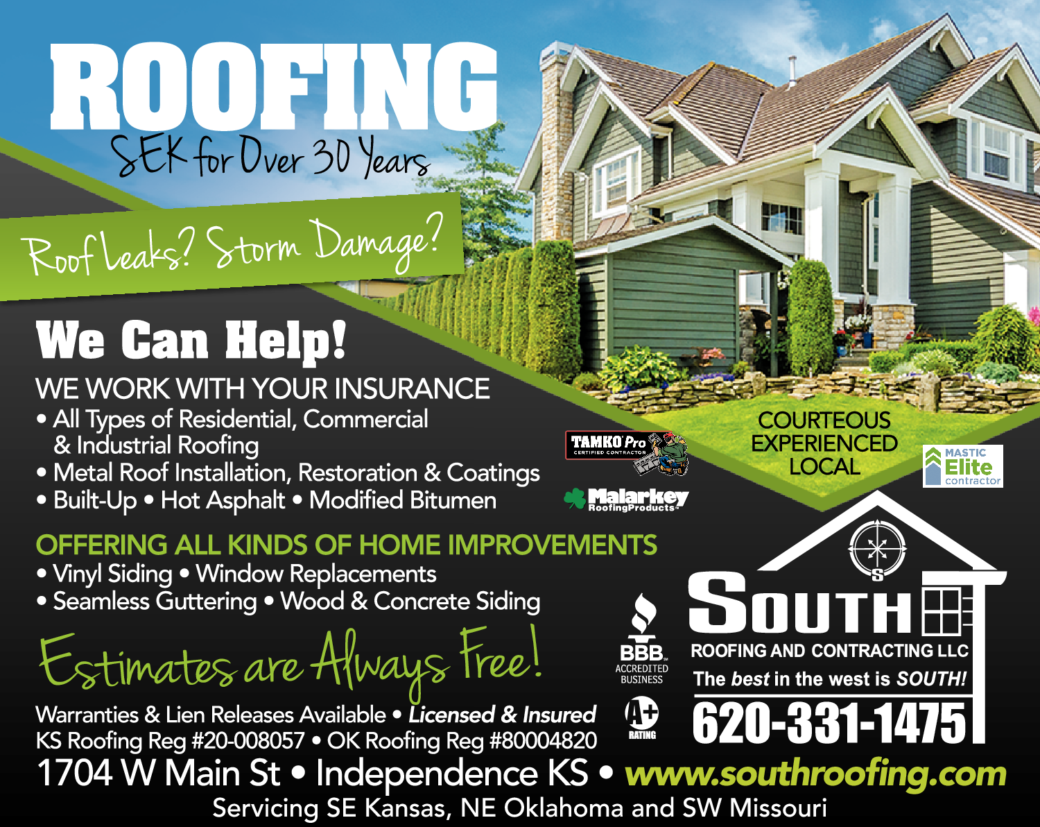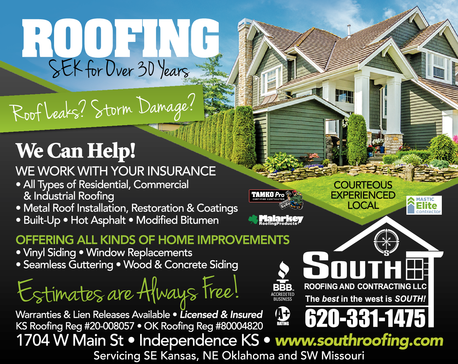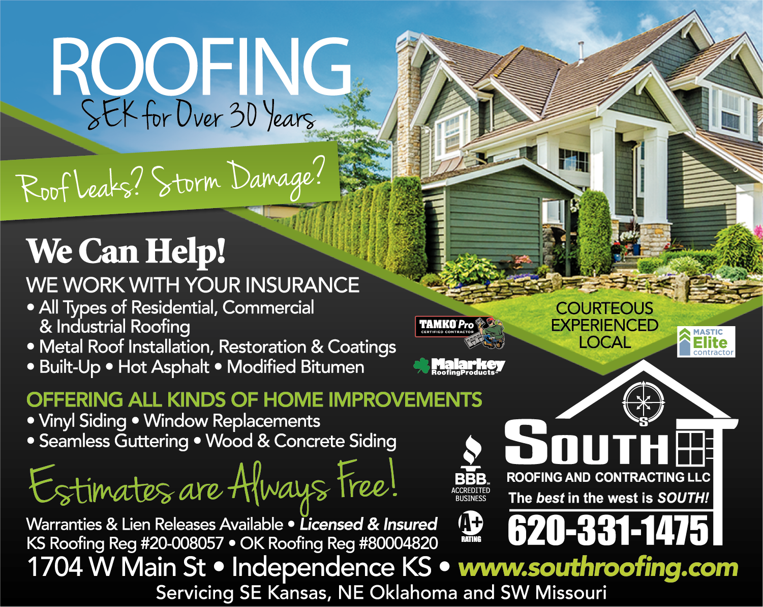 Names and Numbers Verified Roofing Contractors Gutters & Downspouts Gutters & Downspouts - Seamless Metal Roofing & SidingSouth Roofing and Contracting LLC hasbeen servicingthe southeast Kansas and northeast Oklahoma area for 30+ years and it is our mission to provide you with quality roofing and construction services. We take great pride in our work and the relationship we have with you, our…