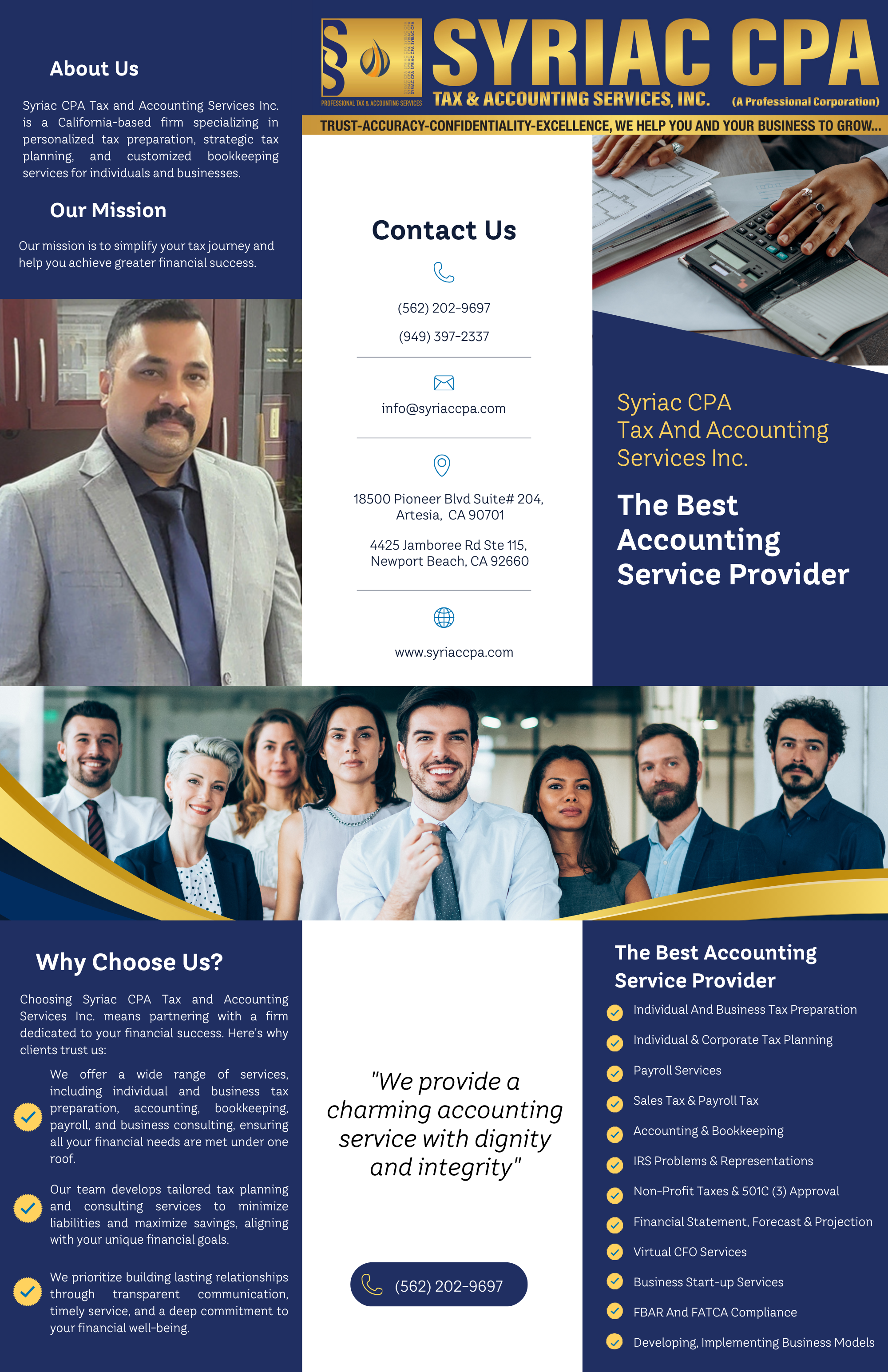 Bookkeeping & Tax Consultants Tax Return Preparation Income Tax Service Tax ConsultantsSyriac CPA Tax and Accounting Services Inc. is a trusted CPA firm based in California, providing comprehensive tax preparation, accounting, bookkeeping, payroll, and business consulting services. We specialize in personalized financial solutions for individuals, small businesses…