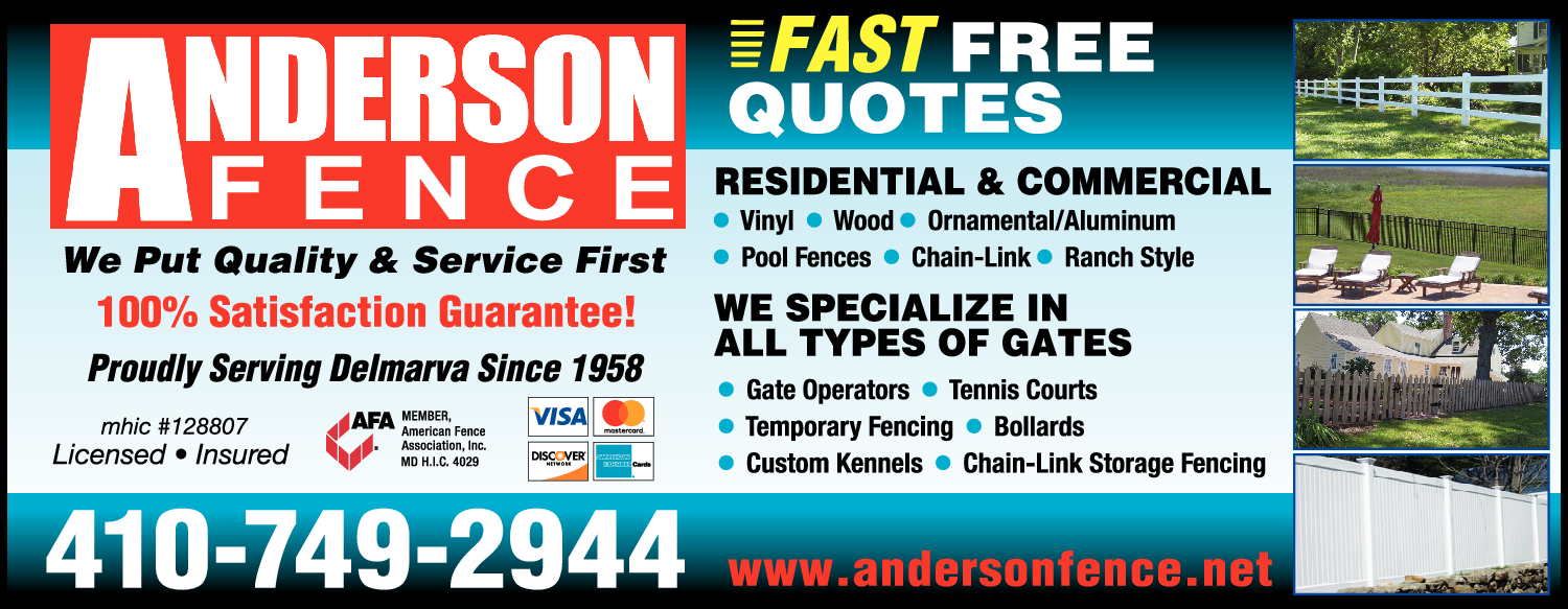 Names and Numbers Verified Fence & Fence Contractors Fence Repair Gates & Operating Devices KennelsAnderson Fence Since 1958 Residential & Commercial Since 1958 Anderson Fence Company Inc. has been building fences. Experience & pride helps Anderson Fence Company stand out. We are locally-owned. Delmarva is our home. We build quality fences that last. We believe in old-f…